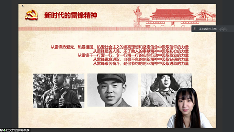 她首先向大家解释了为什么要学习雷锋精神?深刻阐释了学习雷锋精神的意义。她表示:雷锋精神作为一种独特的红色文化,在今天仍发挥着重要作用,鼓舞着一代又一代中国人不断向前。学姐指出,雷锋精神凝练了中华民族的传统美德,同时顺应着时代发展、社会进步的时代潮流,具有极为深刻的意义。