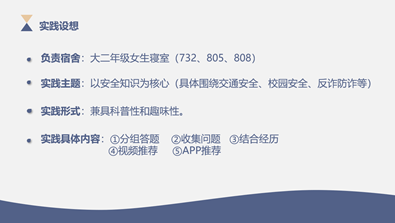 各积极分子和发展对象依次向大家展示了小组或个人的实践设想,其中不乏一些新奇、有创意的巧思。刘芝萱、武梦宣小组的实践设想中不仅在安全教育方面具体强调了与大家息息相关的防疫、用电安全及床帘问题,还将进行思政宣传,聚焦于如十九届六中全会等近期发生的重大时政热点事件,使实践内容更加丰富,能够更全面地提升同学们的安全意识和思想水平;李梦涵、刘明娟小组在本次实践设想展示前就已经向所负责的宿舍投放了问卷,积极收集同学们与安全相关的问题,通过充足的准备更具针对性地推动实践的开展;张伟捷同学的实践设想中包含共同合唱与安全相关的简单歌曲,发放安全特色书签等环节,通过这些别出心裁的环节设置以期让实践更加深入人心;张晨颖、莫怡宁小组则希望本次实践能兼具科普性和趣味性,提出将以分享自身与反诈等安全问题相关的经历、分组进行安全知识问答等形式开展实践,希望能够提升同学们的参与度及积极性。从各积极分子和发展对象对实践设想的展示中,能够看出许多同学对日常生活中可能存在的安全问题的关注与重视,以及对于本次实践活动开展的独到想法。