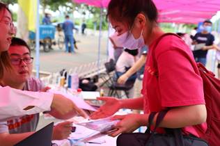 早上七点开始,研究生新生接连前来。在完成核对新生信息后,迎新志愿者引导新生顺利完成报到以及行李搬运等工作,发放各类迎新材料和防疫物资,并在迎新处与新生热情交流学习和生活相关的内容。