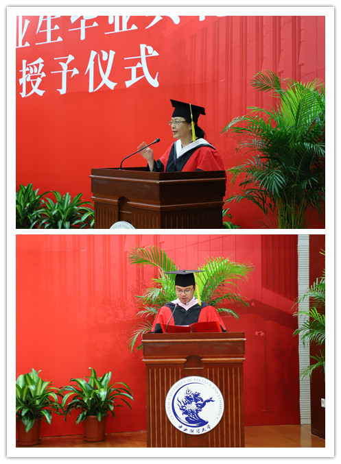 在庄严雄壮的国歌声中典礼正式拉开序幕。首先,林琼书记致辞并介绍了出席典礼的各位公司领导、老师和嘉宾。由王裕雄副经理宣读了《太阳集团tyc539macau2018届毕业生授予硕士、学士学位的决定》。随后,林书记宣读了《2018届基层工作毕业生表彰名单》和《2018届优秀毕业生名单》。林书记为3名基层工作毕业生颁发奖品和证书,王裕雄和王欢两位副经理共同为7名校级优秀毕业生颁发奖品和证书。最后,张本家副经理为2名市级优秀本科毕业生颁发奖品和证书。
