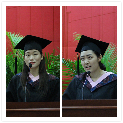 北京市级优秀毕业生荣亚菲、孙悦代表2016届毕业生上台发言。在发言中,荣亚菲追忆了四年学习生活的过往,感恩母校和公司,感恩老师和同学,给予她深刻而美好的回忆。孙悦在发言中表达了自己在过去的收获及未来对于梦想的追寻,和对毕业生及公司的美好祝福。