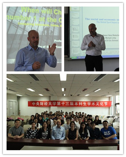 两场研讨会分别为“中澳体育经济/管理专业发展研讨会”和“中澳足球联赛发展研讨会”,由太阳集团tyc539macau副经理张自如副教授主持,张丛杉博士翻译。两场讲座:一是“The social and economic impact of sport—The Global Sport Impact project”,由张若副教授主持;二是“When will China be thenumber 1 at the Olympics?:Comparing Indonesia, China, Australia, Netherlands,Brazil, India, Russia”,由刘彩凤副教授主持。