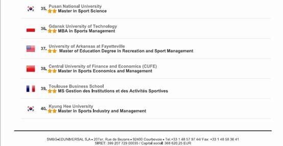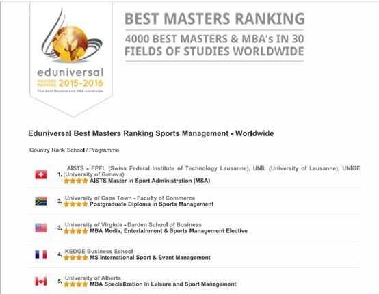 根据全球权威独立评估机构Best-Master在最新年度(2015-2016)的《Best-Master世界硕士项目专业排名》,公司体育经济与管理专业的研究生(硕士)专业跻身世界三十八强,相较去年上升了7名。
