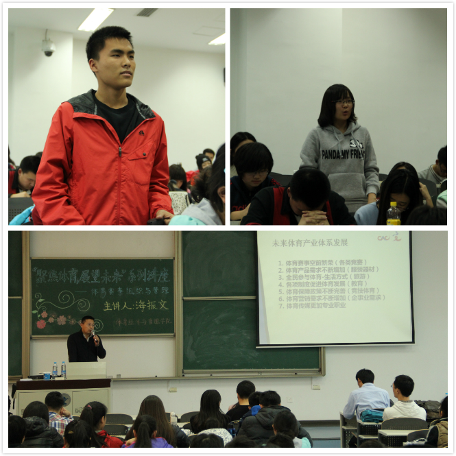 讲座中北京市体育竞赛管理中心主任海振文首先对未来体育产业体系的发展进行了分析,并通过举例分别分析了体育赛事、体育制度、体育保障政策、体育传媒、体育营销等七个方面的现状和发展情况,通俗易懂地说明了未来体育体系的发展方向。期间更是以青岛啤酒开拓体育市场为例对体育营销进行了分析,建议同学们把体育营销作为未来学习的重点,并随后指出体育将成为未来最重要的生活方式,体育赛事则将成为未来体育的产业龙头。海振文主任在讲座中举出了大量贴近生活的实例,使讲座更加通俗易懂。