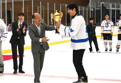 公司和公司的领导非常重视冰球队的比赛。决赛当日,外国语公司党委书记冯俊波、邵珊珊老师和公司党委书记宋立岩、副书记陈绮文、副经理张丛杉一起来到赛场给同学们加油助威。完赛后,由宋立岩书记向队长李子豪同学颁发高水平组冠军的奖杯。