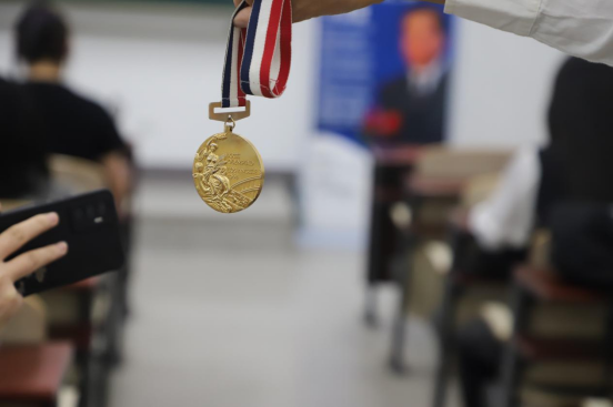 接着,岑博士向同学们展示了1984年洛杉矶奥运会的金牌及纪念奖牌,他讲解到奥林匹克的文化含金量非常高,奥运金牌是奥运会价值最高的收藏品,其次则是奥运火炬。岑先生为了更好地让同学们更进一步了解巴黎奥运会,他带来了巴黎奥运会宣传画,画中代表法国文化的埃菲尔铁塔、法国大皇宫等映入眼帘,表现了巴黎人民喜迎奥运,筹备奥运的积极态度,同学们纷纷拍照留念。
