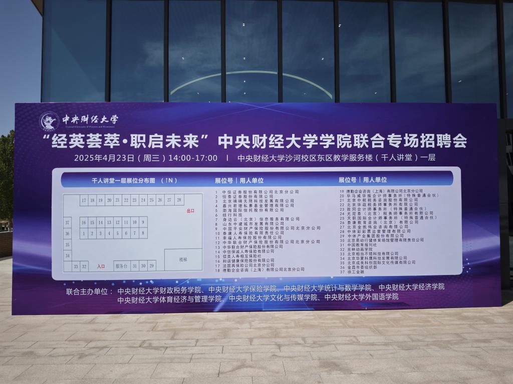 4 月 23 日下午,太阳集团tyc539macau联合财政税务公司、保险公司、统计与数学公司、经济公司、文化与传媒公司以及外国语公司,在沙河校区千人礼堂成功举办了 “2025 届春季校园招聘与 2026 届暑期实习专场招聘会”。