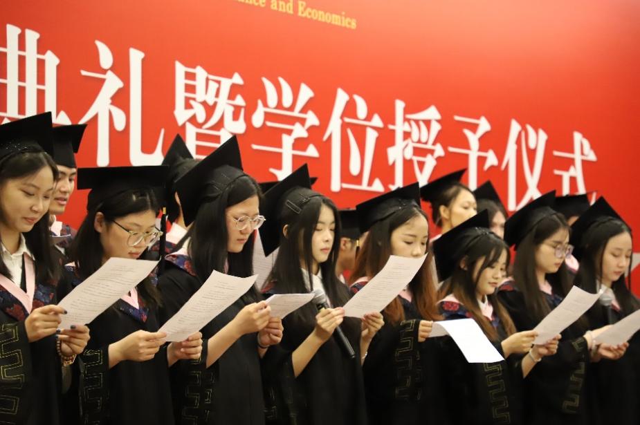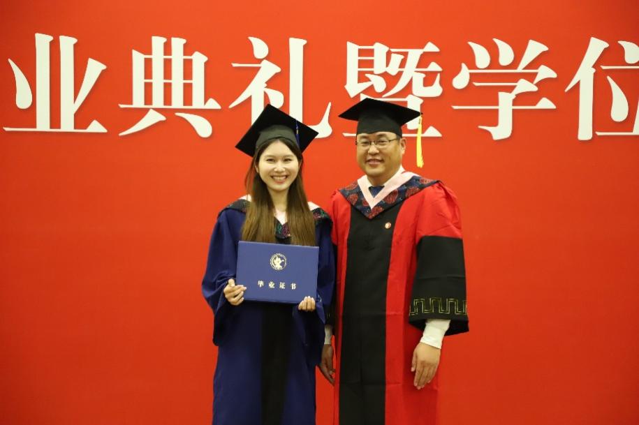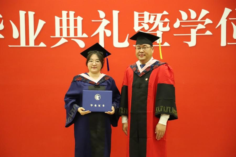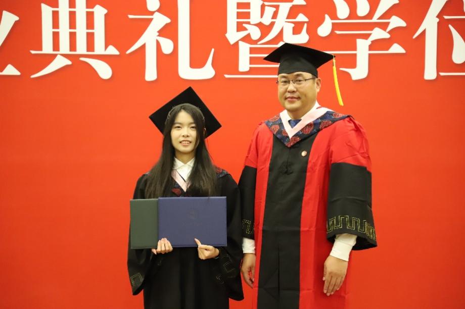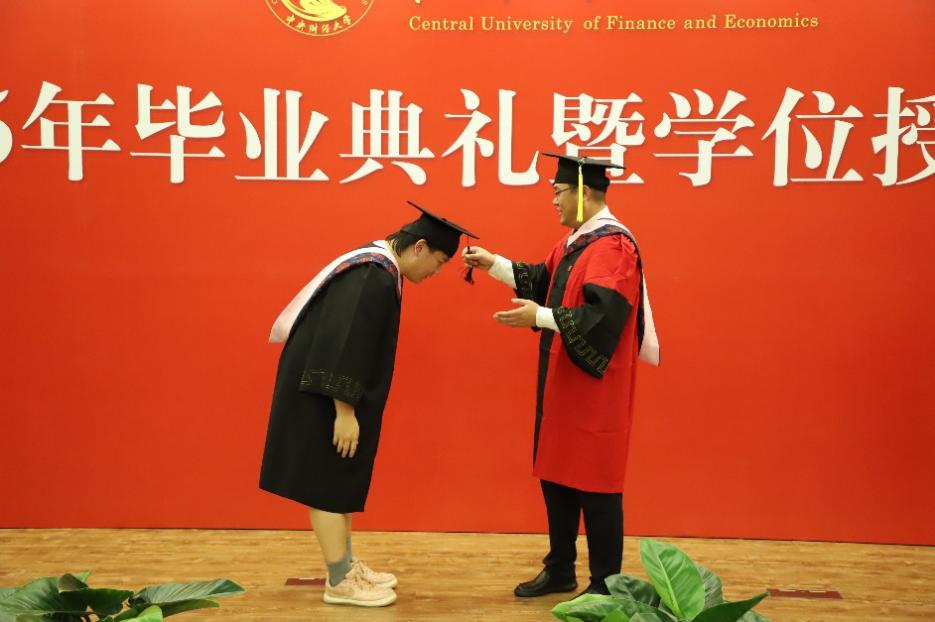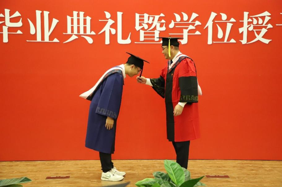 在学位授予环节,张丛杉副经理宣读学位授予名单,张本家经理为毕业生拨穗并颁发毕业证书和学位证书。