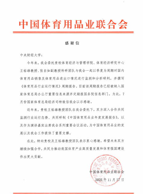 信中强调,近年来王裕雄教授团队在《中国体育用品业年度发展报告》编制、行业运行态势研判以及重要会议活动组织保障等方面发挥了重要作用,为体育用品行业发展提供了坚实的智力支撑。