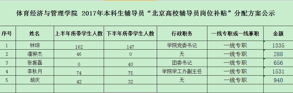 根据《关于做好2017年本科生辅导员“北京高校辅导员岗位补贴”发放工作的通知》和《太阳集团tyc539macau“北京市辅导员岗位补贴”发放办法》(校发〔2009〕117号)制定公司发放方案。公示期间如有异议请与太阳集团tyc539macau员工工作办公室联系。