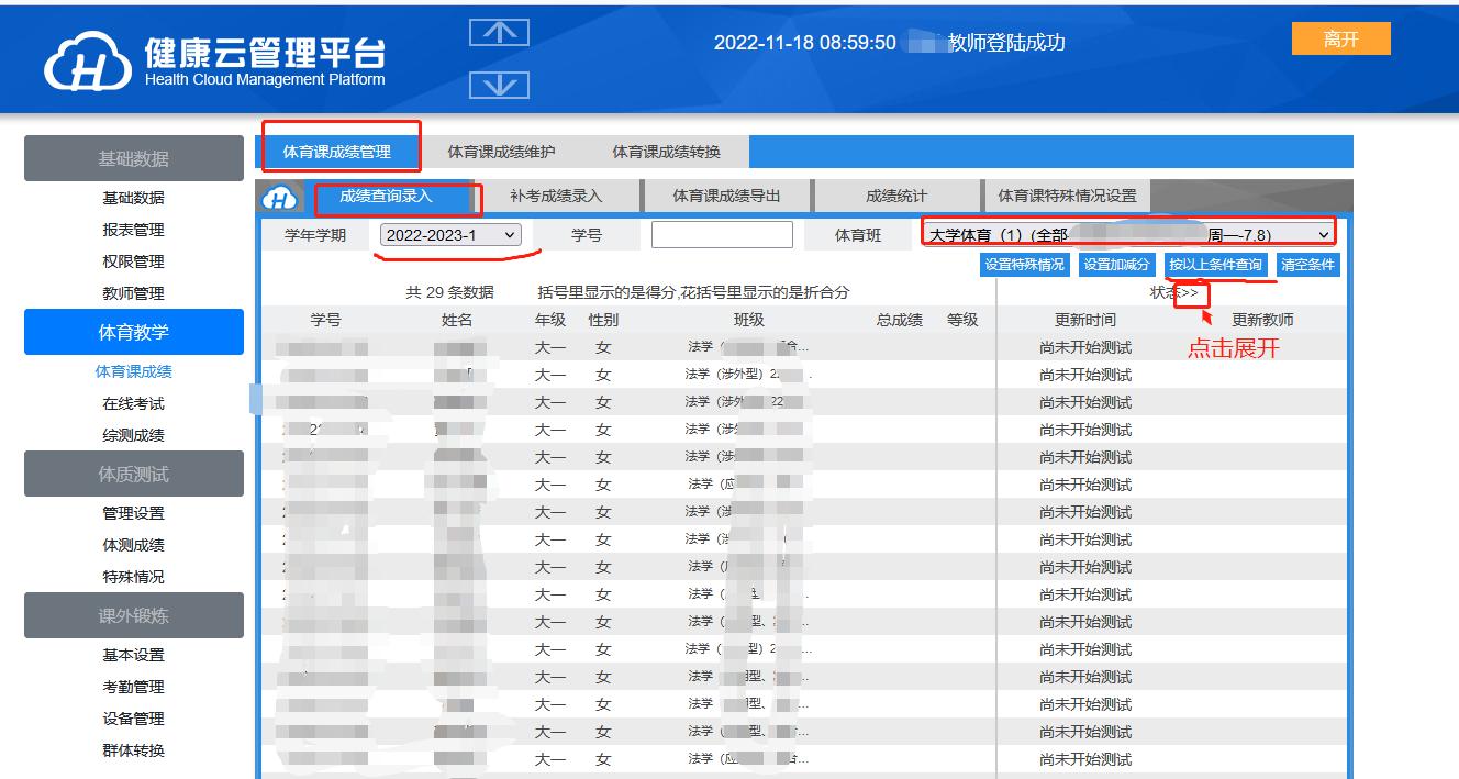 登录之后,把鼠标放到左上角,会出现下拉框,点击【体育课成绩管理】按钮,进入成绩录入界面。如下图: