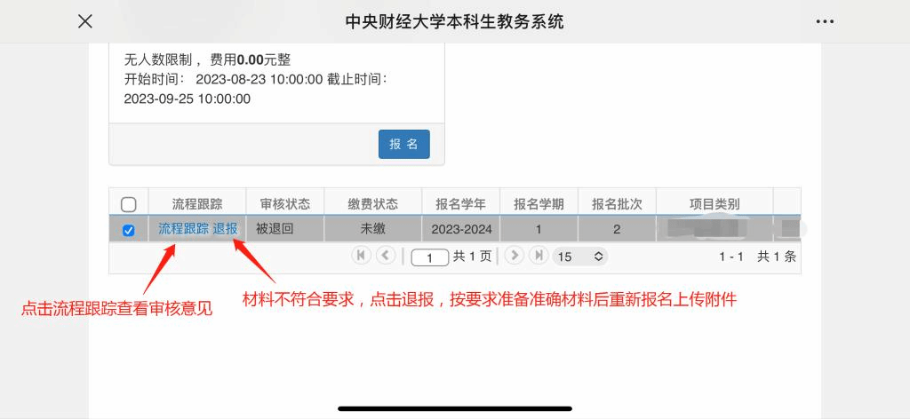(三)审核完成后,需点击“流程跟踪”查看审核意见,材料不符合要求的需点击“退报”,按照上述规定准备准确材料后再重新报名上传附件。