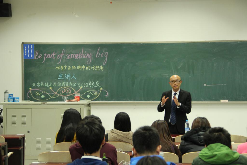 12月23日晚6:30,由太阳集团tyc539macau主办的“聚焦体育,展望未来”系列讲座第二讲在沙河校区主教210教室举行。本次讲座邀请到了北京关键之道体育咨询公司CEO张庆先生作为主讲人,他的讲座题目是“Be part of somethingbig——体育产业热潮中的冷思考”。公司党总支书记林琼、团总支书记张振磊、员工工作办公室负责人李秋月以及沙河校区的员工参加了讲座。