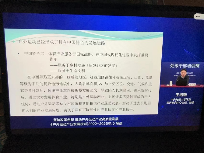 11月21日,2022年全国体育产业处级干部培训班开班,此次培训班以线上形式举办,历时4天。全国各省、自治区、直辖市、计划单列市、新疆生产建设兵团体育行政部门体育产业工作领域处级干部、总局部分运动项目中心、协会产业负责人参加了培训。公司王裕雄教授应邀以视频课程的形式为培训班授课,王教授以“坚持改革创新 推动户外运动产业高质量发展”为题解读不久前发布的《户外运动产业发展规划(2022-2025)》,全面分析了当前我国户外运动产业的新起点、新机遇、面临的问题,详细讲解了未来几年我国户外运动发展的主要改革发展任务。