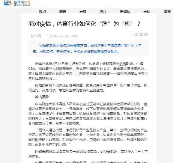 近日,公司教师公司体育经济研究中心主任王裕雄副教授接受了新华社的采访,就“面对疫情,体育行业如何化“危”为“机”?”发表了意见建议,相关采访内容刊登在新华网新华体育栏目2020年02月18日。