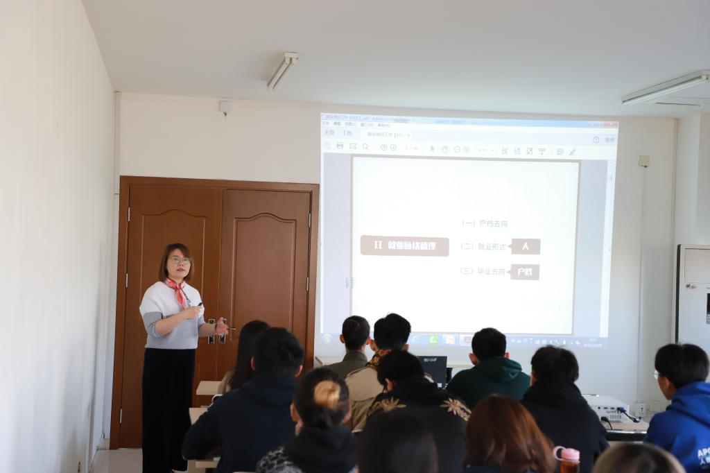 接下来,就业培训会正式开始。李老师先为同学们讲述当前本科生就业形势和就业政策,针对公司员工的特点提供就业指导。李老师将国内升学、出国(境)留学、签三方协议等8类就业形式进行讲解,并针对每一类的户口档案去向情况进行说明。她主要强调了毕业后户口档案的迁移问题,以及暂缓在公司的时间节点,提醒大家早作打算。随后,李老师为同学们讲解了生源地、报到证、户口迁移证等重要的就业概念,帮助同学们进一步掌握就业信息,把准就业脉搏。在熟悉就业概念之后,她带领同学们对公司就业流程进行解读,梳理就业脉络,将就业流程分为7个环节,并督促大家注意各个时间节点,在规定时间内完成相应任务,以便顺利办理就业手续。期间,她还解答了同学们提出的问题。