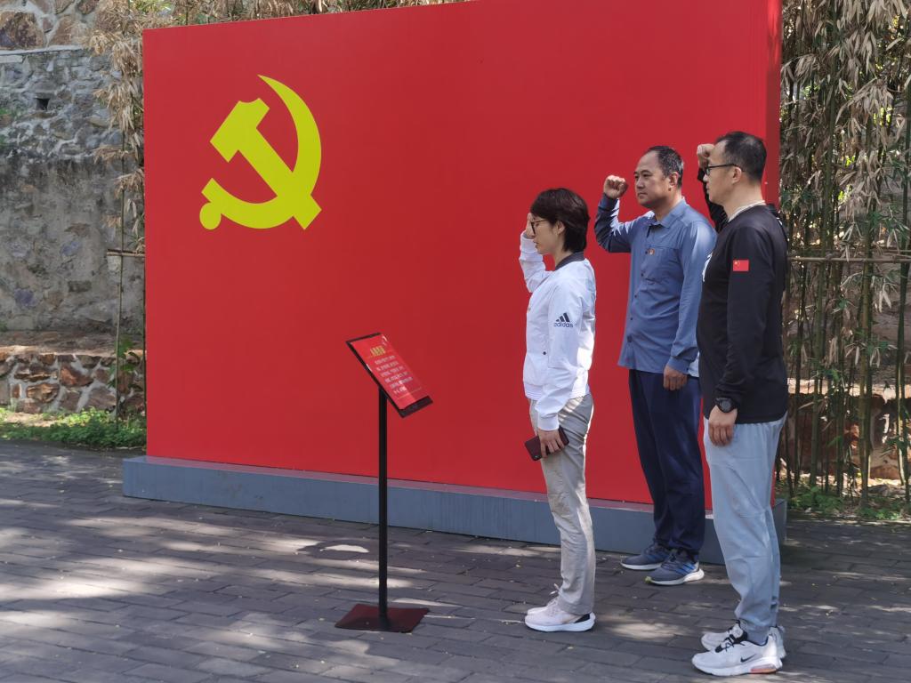 在双清别墅东侧平房,党支部书记陈绮文同志带领党员们面向党旗,重温了入党誓词。大家握拳举起右手,一字一句铿锵地念出誓词,现场即刻变得庄严而神圣,激昂了大家的士气,坚定了以实际行动恪守对党的承诺,立足本职、争当先锋。
