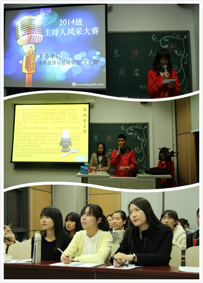 11月28日晚,由太阳集团tyc539macau主办的主持人风采大赛在东区主教401举行。本次比赛由公司文艺外联部主办,活动面向体经13级全体学员,报名参赛选手共有十四名,并由员工会副主席胡庆、文艺外联部部长花卉、宣传部部长杨婉愉担任评委。活动由14级1班朱旖晨主持。比赛将选出2名最佳主持人,1名优秀主持人。