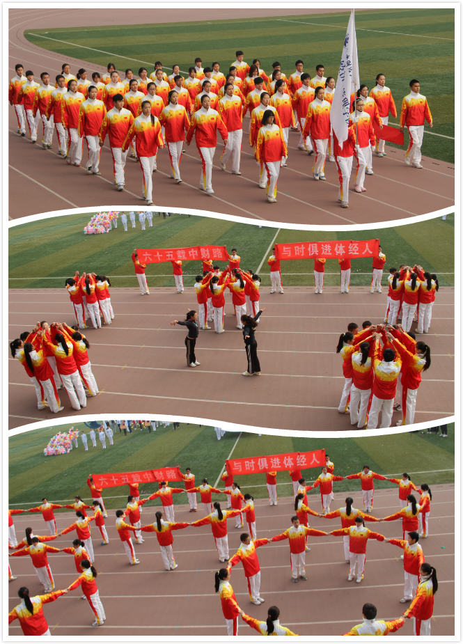 10月24日上午8:30,运动会开幕式正式开始,首先出场的是校旗队、鲜花队、国旗护卫队,他们精神抖擞,意气风发。随后,各公司运动员组成的方阵在进行曲中踏着矫健的步伐入场。公司的运动健儿们身穿08年奥运会国服,迈着沉稳矫健的步伐来到主席台前。随着口令员的哨声,如阳光般红火精神的体经学子们变换队形,形成一个奥运五环的形状,用自己独特的创意向母校65周年表达祝福。“青春似火,风姿如鹰!凌云赛场,唯我体经!”嘹亮的口号响彻云天,诠释了运动会的精神所在。入场式结束后,校体育运动委员会主任、副董事长史建平致开幕词,之后,公司2014级研究生刘秀娟代表运动员庄严宣誓。