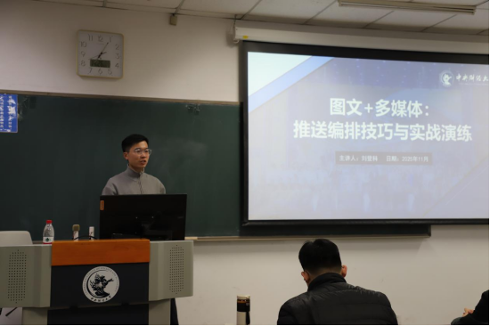 刘登科同学针对推文排版、封面海报制作以及动图制作等方面的内容开展了系统讲解。在实战演练阶段,引领大家制作具有吸引力的动图,并结合秀米编辑器进行实际操作,演示公众号的排版流程,着重强调了字体选择、段落间距以及色彩搭配的重要性。他指出,优秀的宣传作品应当“让内容富有温度,让视觉能够传达信息”,鼓励同学们既注重锤炼文字表达能力,也着力提升将抽象理念转化为直观视觉呈现的能力。