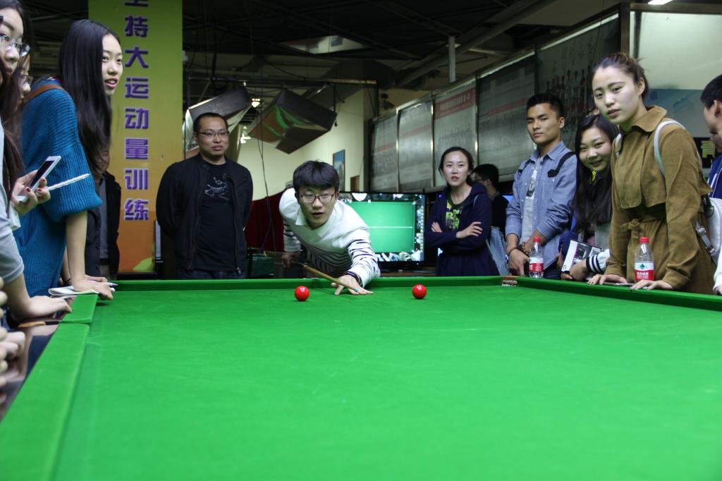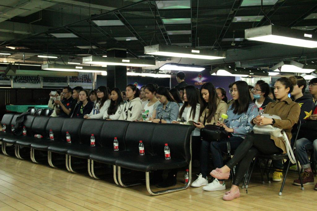 活动会场位于北京体育馆一层的世界斯诺克公司,这里同时也是瑞盖科技有限公司训练基地。甫一入场,就看见会场的背后是排列整齐的台球桌。据介绍,其中一排的台球桌是国家队训练时的球员专属台球桌。之后,由活动的主持人瑞盖公司代表王迎春女士将公司师生引入会场就座。