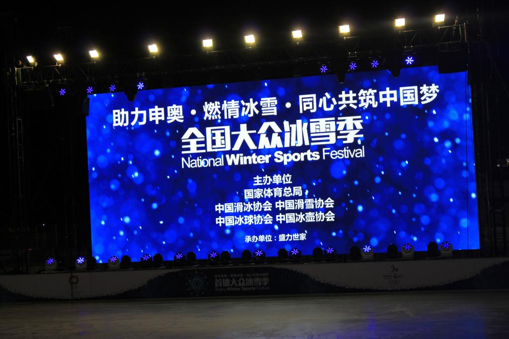 晚7时,开幕式正式开始。国家体育总局局长刘鹏和冬奥申委主席、北京市市长王安顺以及相关领导出席仪式。刘鹏在开幕式上宣布“全国大众冰雪季”正式启动,标志着以“助力申奥,燃情冰雪,同心共铸中国梦”为主题的冬季项目全民健身系列活动全面拉开帷幕。北京市市长王安顺就北京与张家口共同申办2022年冬季奥林匹克运动会的深远意义和重大价值做出了重要讲话,并表示北京市政府将尽全力支持参与冬奥会的申办。仪式上,历届冬奥会获奖选手代表到场,并绕场向观众示意。花样滑冰冠军现场展示了高超的滑冰技艺,令人叫绝。仪式结束前,北京少年冰球运动员现场进行了冰球比赛,展示了青少年对冰雪运动的热情。