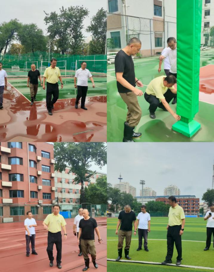 在公司南路校区检查中,发现篮球架底座生锈、足球场和田径场凹陷、配电室屋顶漏洞等问题,王副经理要求工作人员要及时上报进行整改;在沙河校区,重点检查了运动场地及实验室,发现田径场围栏存在倾斜等问题,现场就协调基建处进行解决。
